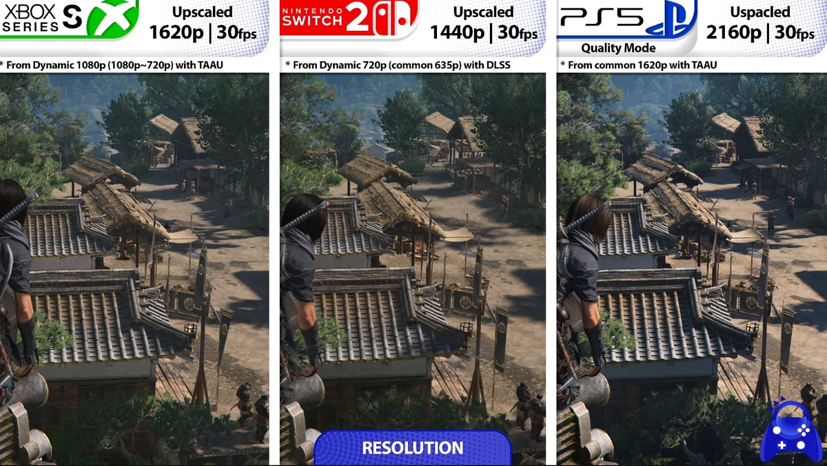 Сравнения Assassin's Creed Shadows между Switch 2, Xbox Series S и PS5 (в режиме 30 кадров