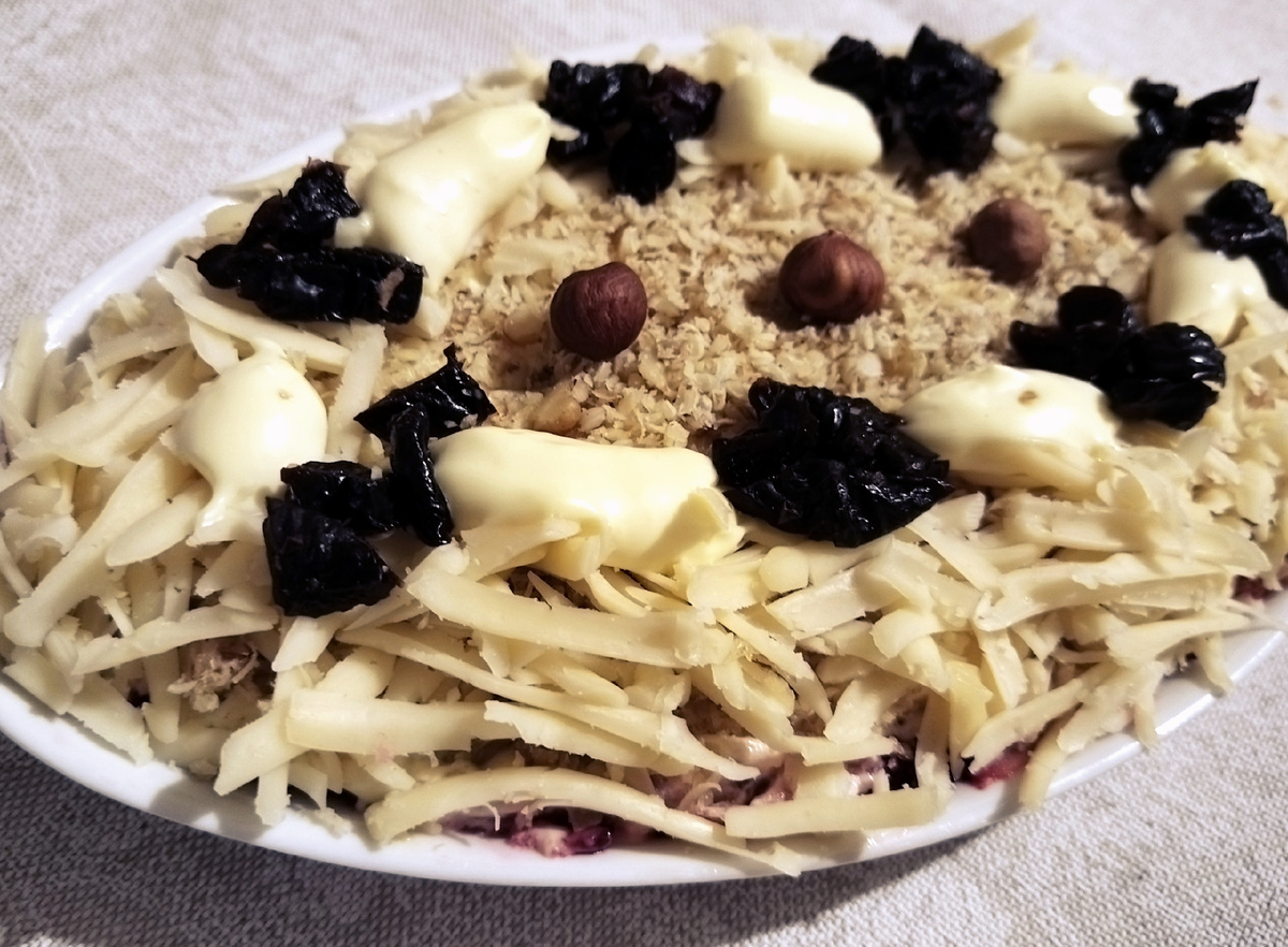 Идеально подойдет как для праздничного стола, так и для уютного вечера, где сладость свеклы и чернослива прекрасно сочетается с кислинкой яблока, пикантностью сыра и хрустом грецких орехов. Свекла: 2-3 средних корнеплода (лучше отварная или запеченная) Яблоко: 1-2 шт. (кисло-сладкое, например, Гренни Смит или Антоновка) Грецкие орехи: горсть (слегка поджаренные для аромата) Сыр: 100-150 г (твердый или полутвердый, например, Российский, Гауда, Пармезан) Чернослив: 50-70 г (без косточек) Для заправки: Майонез (или сметана/натуральный йогурт для более легкого варианта) Соль, свежемолотый черный перец – по вкусу Подготовка свеклы: Если вы используете отварную свеклу, очистите ее и натрите на крупной терке. Если запекали – тоже очистите и натрите. Подготовка яблока: Яблоко очистите от кожуры и сердцевины, натрите на крупной терке. Чтобы яблоко не потемнело, можно сбрызнуть его небольшим количеством лимонного сока. Подготовка орехов: Грецкие орехи можно слегка подсушить на сухой сковороде