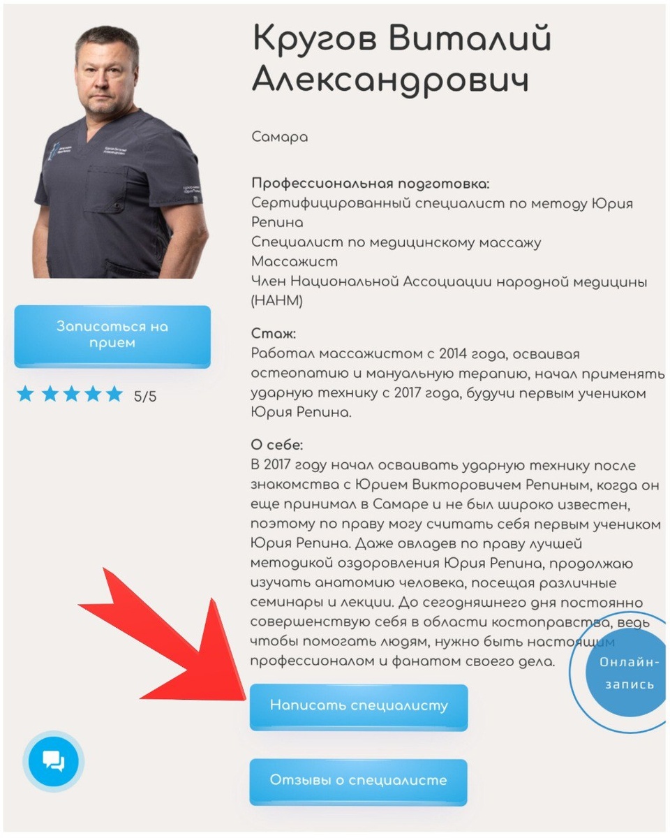 📍НАПИШИ НАШЕМУ СПЕЦИАЛИСТУ Да, вы всё правильно прочитали. Теперь между вами и специалистом — нет посредников (но операторы всегда также готовы вам помочь). Только вы и человек, который будет вести ваш приём. Как это работает? 1⃣ Заходите на наш сайт — massagerepin.com/ 2⃣ Открываете раздел «Специалисты» 3⃣ Выбираете того, к кому хотите обратиться 4⃣ Нажимаете кнопку «Написать специалисту» 5⃣ Вас автоматически переводит в Telegram-бот специалиста 6⃣ Нажимаете «Старт» и можете задать свой вопрос Что можно уточнить? ✔ прислать результаты МРТ, чтобы специалист предварительно посмотрел ✔ спросить о личных противопоказаниях ✔ уточнить важные детали перед процедурой ✔ написать после приёма, если появились вопросы по рекомендациям ✔ получить комментарий именно того специалиста, у которого вы хотите пройти процедуру Это прямая связь с теми, кто каждый день работает с позвоночником и кто будет вести именно ваш случай. Такая возможность крайне редкая, в большинстве центров общение со специ