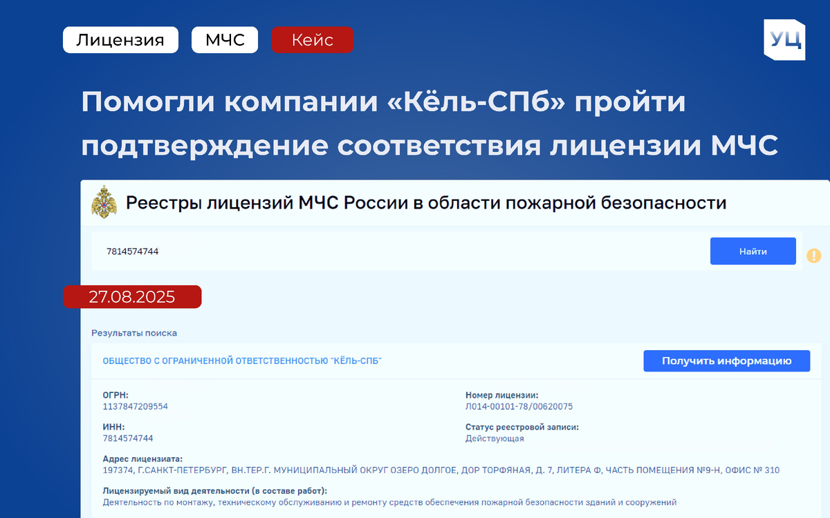 #Кейс #ПожарнаяЛицензия #МЧС #Лицензирование ООО «КЁЛЬ СПБ» — российское подразделение немецко-люксембургского концерна «КЁЛЬ Машиненбау АГ», специализирующееся на комплексном оснащении промышленных предприятий. С организацией мы впервые начали сотрудничество в 2022 г. В этом году компания обратилась к нам для подтверждения соответствия лицензии МЧС. Мы помогли переоформить лицензию МЧС России под ключ и оказали полное юридическое сопровождение, включающее: ✔️Помощь в подаче заявления через портал Госуслуг; ✔️Обучение сотрудников в соответствии с приказами МЧС и регистрацию в ФИС ФРДО; ✔️Проведение аудита документации на соответствие лицензионным требованиям; ✔️Выезд на проверку помещения; ✔️Помощь в составлении документации. ❓Зачем проходить подтверждение соответствия лицензии МЧС? Процедура проводится каждые три года со дня предоставления лицензии, если больший период не предусмотрен положением о лицензировании конкретного вида деятельности. Если заявление не подано, действие лиценз
