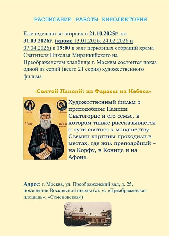 02 декабря 2025 г. (вторник) в 19:00 в зале церковных собраний храма Святителя Николая Мирликийского на Преображенском кладбище г. Москвы состоится показ: «Святой Паисий: из Фарасы на Небеса», фильм 7-й. Художественный фильм о преподобном Паисии Святогорце и его семье, в котором также рассказывается о пути святого к монашеству. Съемки картины проходили в местах, где жил преподобный – на Корфу, в Конице и на Афоне. ⛪️ Адрес: г. Москва, ул. Преображенский вал, д. 25, помещение Воскресной школы (станция метро «Преображенская площадь», «Семеновская»)