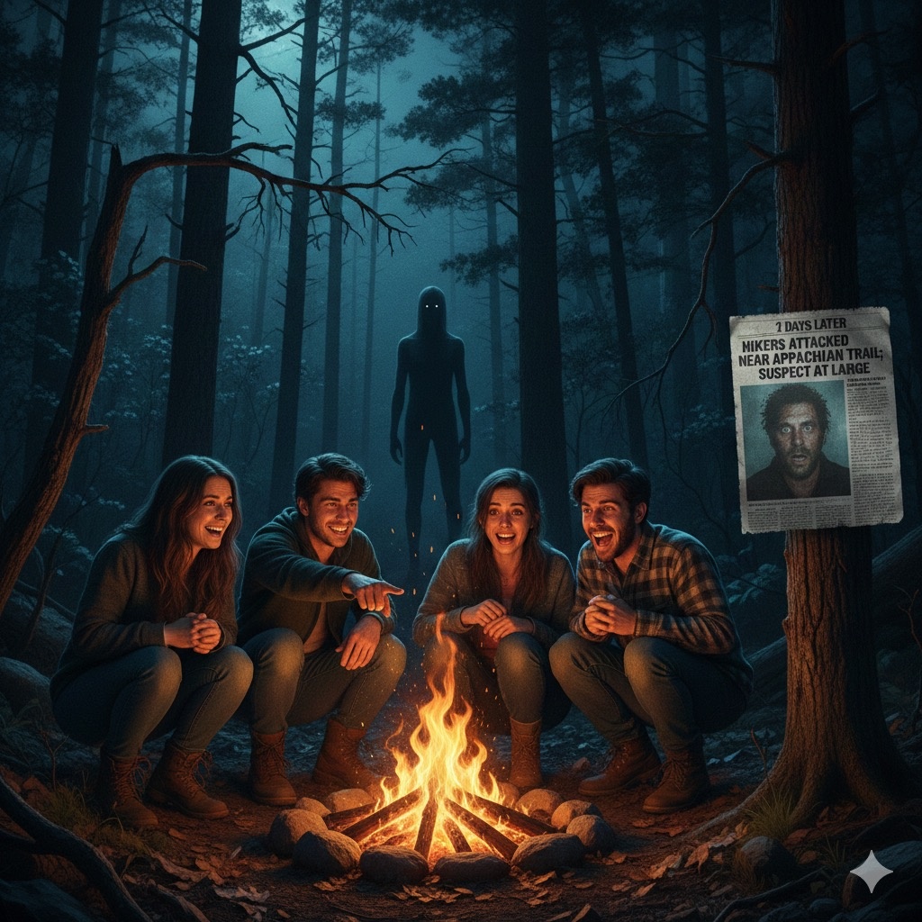 Мы тогда были пацанами по восемнадцать — уверенные, что вечные, бессмертные, и весь мир нам по колено. Четверо друзей, палатки, костёр и глухие Аппалачи вокруг. Ни связи, ни цивилизации — только потрескивание костра, веток и редкие звуки ночного леса. Ближе к полуночи сидим у огня, болтаем, хохочем, вспоминаем чьи-то глупости. И вдруг друг, сидящий рядом, резко сжимает мне ногу. Я сначала хотел стряхнуть его — думал, прикалывается. Но он смотрел в темноту такими глазами, что мне стало не по себе. Он молча ткнул пальцем в сторону деревьев. И там, между стволами, стояла фигура. Чёткий тёмный силуэт мужчины. Не медведь, не куст, не тень. Человек. Стоял и смотрел прямо на нас. Мы переглянулись, и один из пацанов, набрав воздуха, выкрикнул в темноту: — Эй! Кто там? Ответа не было. Фигура слегка повернулась… и исчезла между деревьев, будто её там и не было. Нам всем стало слишком страшно. Смех пропал сам по себе. Было уже около полуночи, палатки стоят, дров мало, а мы — четверо вос