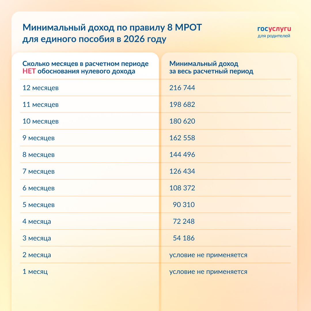 Для назначения единого пособия в 2026 году минимальный доход каждого трудоспособного члена семьи за 12 месяцев расчетного периода должен быть не менее 8 МРОТ. 🔹 Если заявление в декабре 2025