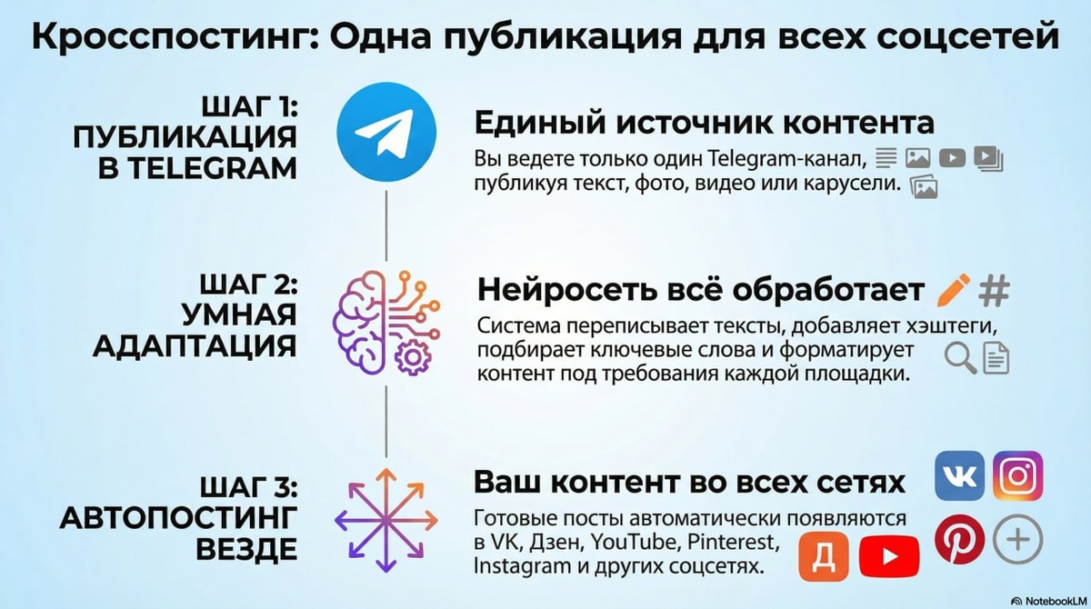 Нейросеть + $10: Как я делаю вирусный кросспостинг в 5 соцсетей из Telegram! Надоело тратить часы на постинг в Дзен, VK, YouTube? Я нашел решение! Теперь я веду только Telegram-канал, а нейросети делают всю работу. Это настоящий прорыв для кросспостинга! Ваш контент в 5 сетях за $10 в месяц! Публикуете в Telegram? Система забирает контент. Нейросети переписывают текст, добавляют заголовки, хэштеги для лучшей выдачи. Затем всё публикуется в Дзен, YouTube, VK. Wordstat подключен для высокочастотных ключей. Главный расходник — сервис Make, всего $10 в месяц. Доступ к готовым решениям для кросспостинга из Telegram в VK и другие платформы. Это умный сервис кросспостинга! А вы готовы автоматизировать ваш кросспостинг в социальных сетях? Поделитесь своим опытом!