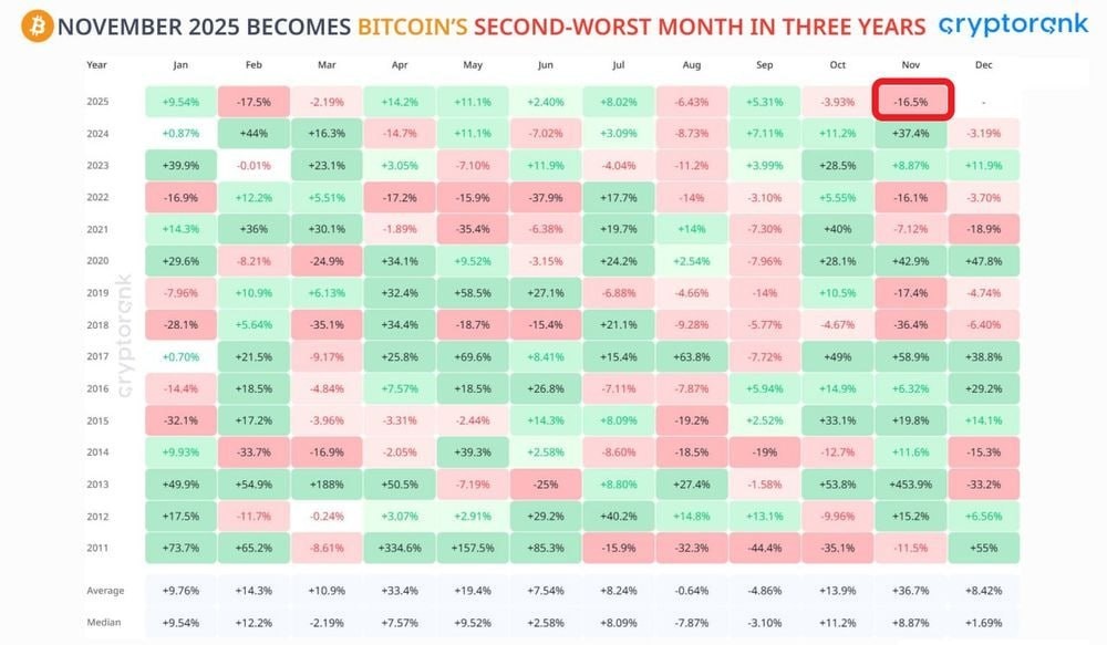 ⚠️✴️ Ноябрь 2025 года стал для BTC вторым худшим месяцем за 3 года
