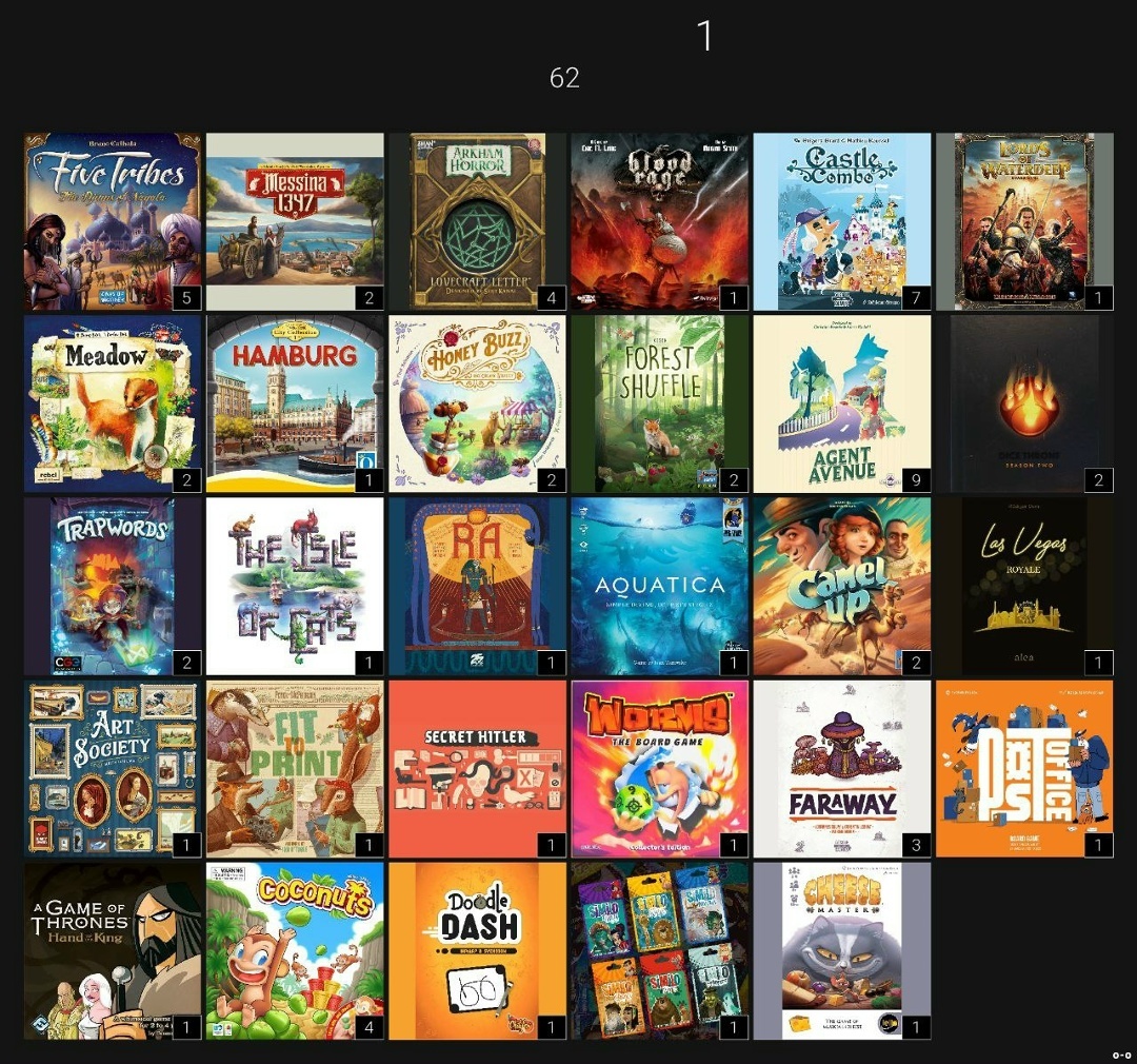 В этом месяце сыграли 62 партий в 29 игр. Из них 10 новых: Мессина1347, Тайное послание:Аркхэм, Кровь и Ярость, Lords of Waterdeep, Поляна, Honey buzz, РА, Секретный Гитлер, Почта и Улица Шпионов.