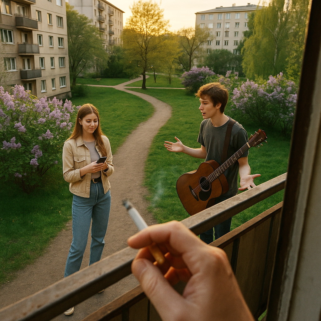 Тёплый весенний вечер застыл в воздухе, пахло цветущей сиренью. Антон вышел на балкон покурить – давно укоренившаяся привычка, от которой он не мог избавиться. Внизу, в сквере между домами, он заметил знакомую фигуру дочери. Алина стояла, уткнувшись носом в телефон, а перед ней – тот самый Вадим, долговязый и нескладный, с гитарой за спиной.