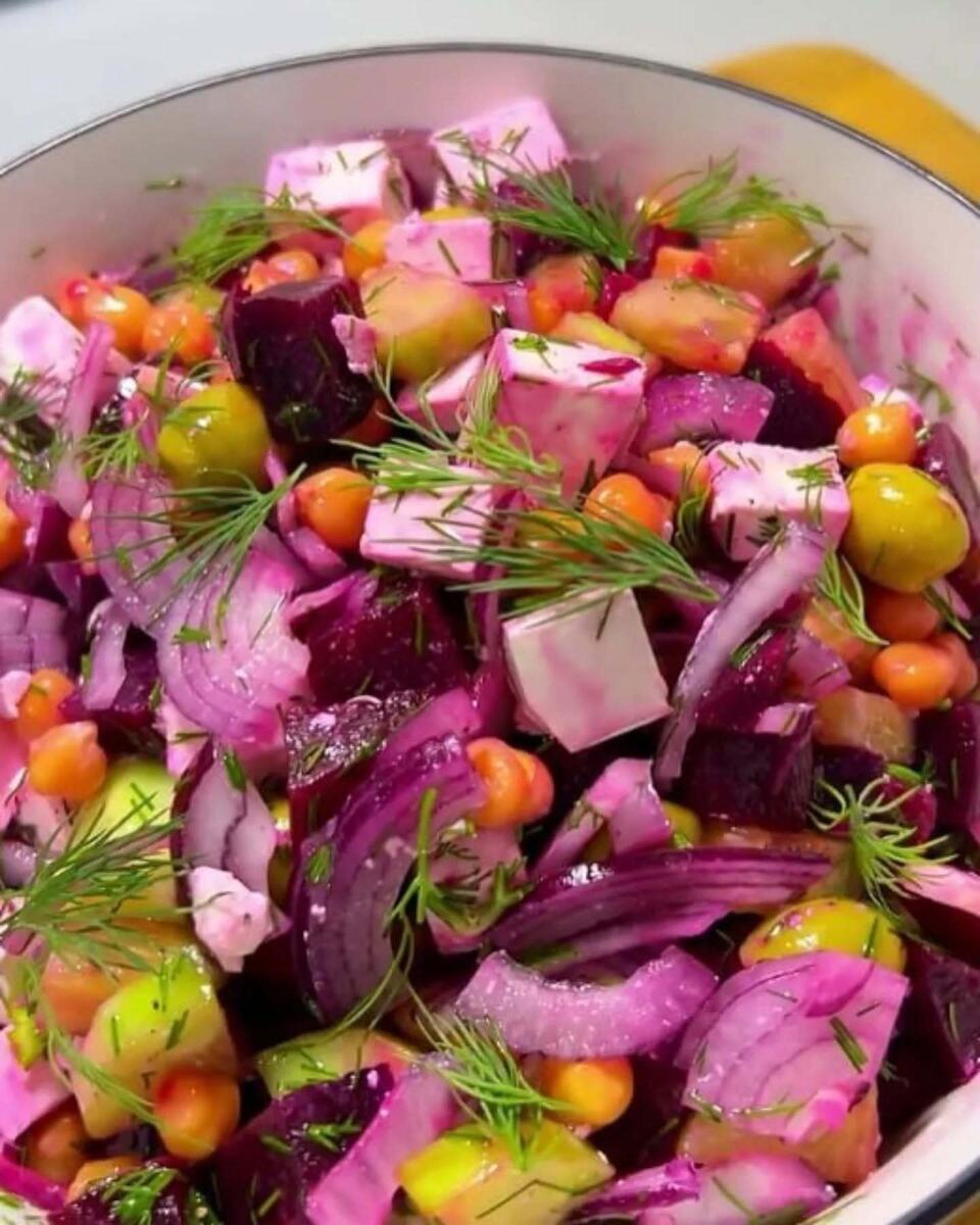 Ингредиенты: - Лук красный 1 штука (маленькая) - Огурец 1-2 штуки - Сыр фетаки 200 гр. - Свекла 1-2 шт. (отварная) - Укроп по вкусу - Нут (отварной) - Оливки 80-100 гр. - Соль по вкусу - Перец по вкусу - Масло растительное Приготовление: 1. Заранее отвариваем нут. 2. Лук красный режим на полукольца, огурец очищаем и режем на средние кубики, сыр фетаки и отварную свеклу режим на кубики. 3. Все ингредиенты соединяем в миске добавляем укроп, соль и перец, масло растительное, оливки. Приятного аппетита, мои хорошие😋 ⠀