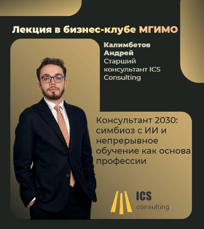Первая лекция консультанта ICS Consulting в бизнес-клубе МГИМО: старт консультационной карьеры в новых реалиях В пятницу в бизнес-клубе МГИМО состоялась первая лекция старшего консультанта ICS Consulting, Андрея Калимбетова — нашего коллеги и студента МГИМО. Согласно свежему исследованию McKinsey и MIT, ИИ может заменить 11,7% рабочих мест в США, затрагивая зарплаты на $1,2 трлн, в основном в логистике, HR, финансах и менеджменте. Как же преуспеть в новых реалиях? 💬 Андрей рассказал о консалтинге, карьере и искусственном интеллекте, особое внимание уделив роли консультанта будущего — человека, способного сочетать глубокие профессиональные знания с пониманием цифровых трендов и вызовов рынка труда. Для Андрея выступление в таком формате стало дебютным. Это начало новой волны консультантов, которые на понятном и доступном языке помогают молодым специалистам построить успешную карьеру в условиях цифровой трансформации. Андрей подчеркнул: ИИ не отнимет будущее консультанта. Он замени