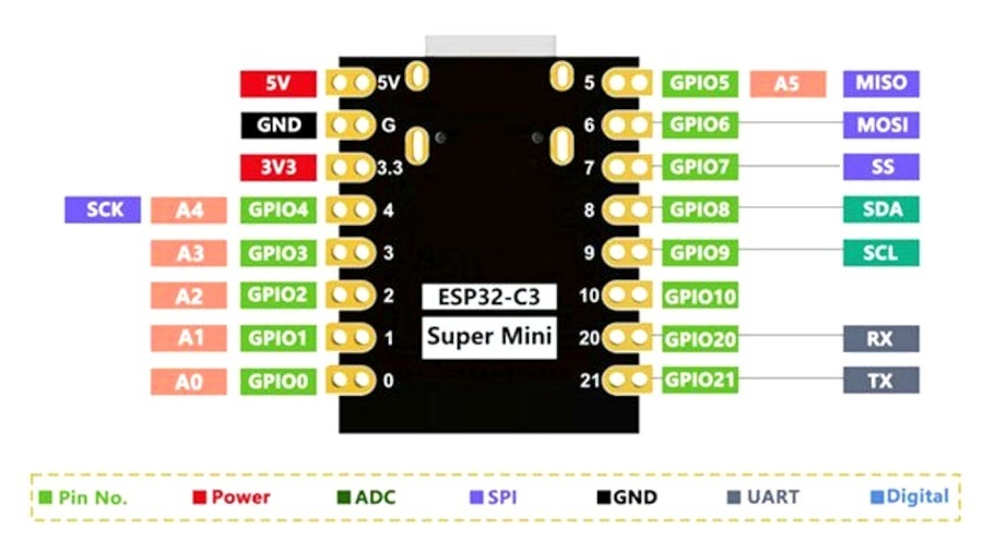 Поддержка Bluetooth: Bluetooth 5 - Перед использованием убедитесь, что установлены библиотеки Adafruit_SSD1306 и Adafruit_GFX через Менеджер библиотек Arduino IDE. - OLED-дисплей подключается к I2C шине ( SDA — GPIO8, SCL — GPIO9 у ESP32-C3). - Значение RSSI (Received Signal Strength Indicator) обычно варьируется от примерно -25 dBm (максимальный уровень) до -90 dBm (очень слабый сигнал). Ниже приведён пример кода на языке C++ для использования с платформой Arduino. Пример использует библиотеку WiFi.h для работы с Wi-Fi, а также библиотеку Adafruit_SSD1306 для управлени