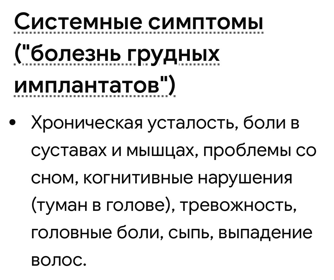 Оказывается даже есть термин «болезнь грудных имплантатов» с возникновением когнитивных нарушений и выпадением волос 🤔