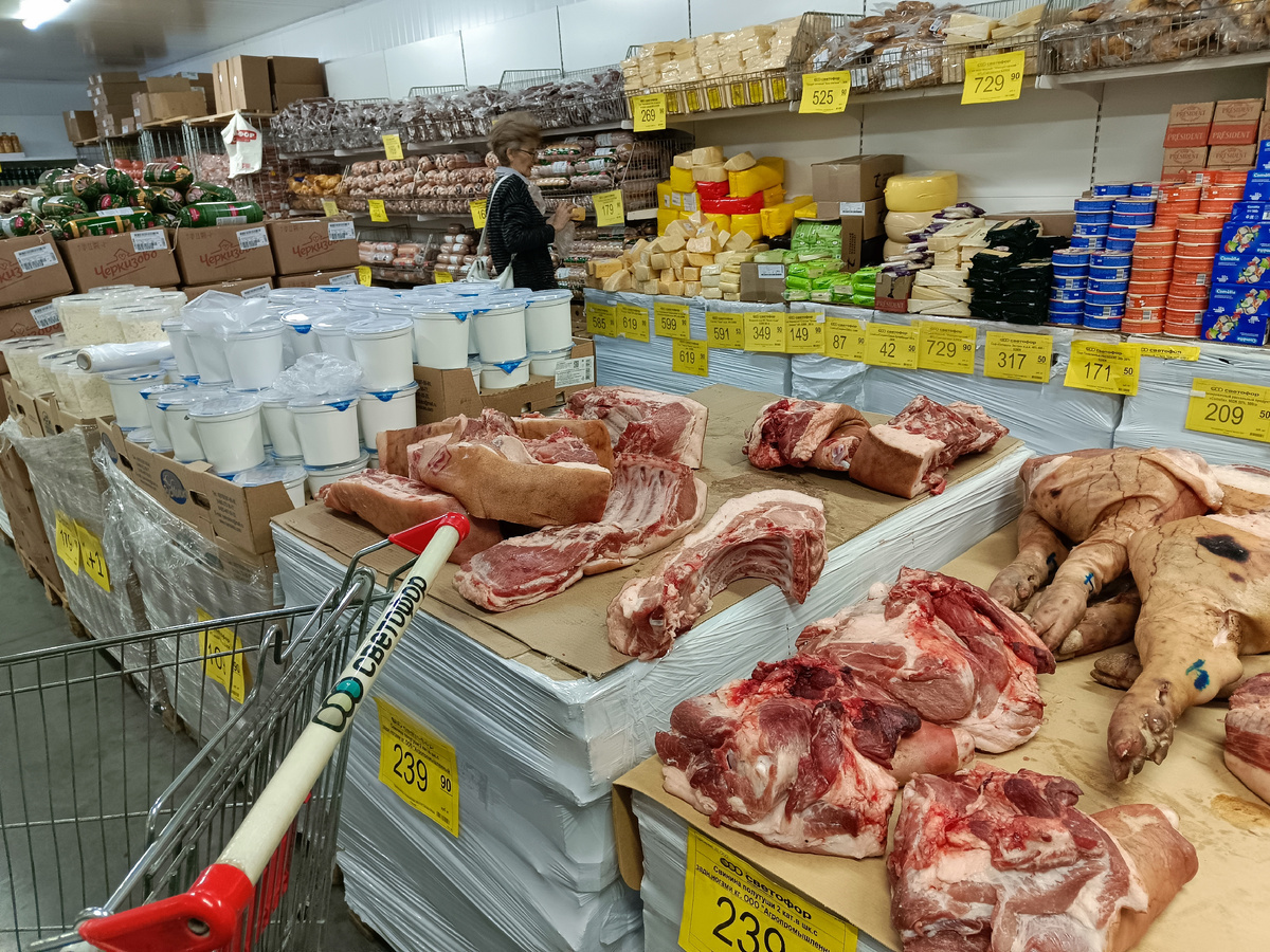 Первым делом, конечно, к мясным рядам! После утреннего завоза свинины остались только "мамонты" килограмм по 5-7. Но мне, как мужику, это только в радость! Купил кусок на шашлык, остальное пустим на холодец. Цена - 240 рублей за кило. Вполне божески!