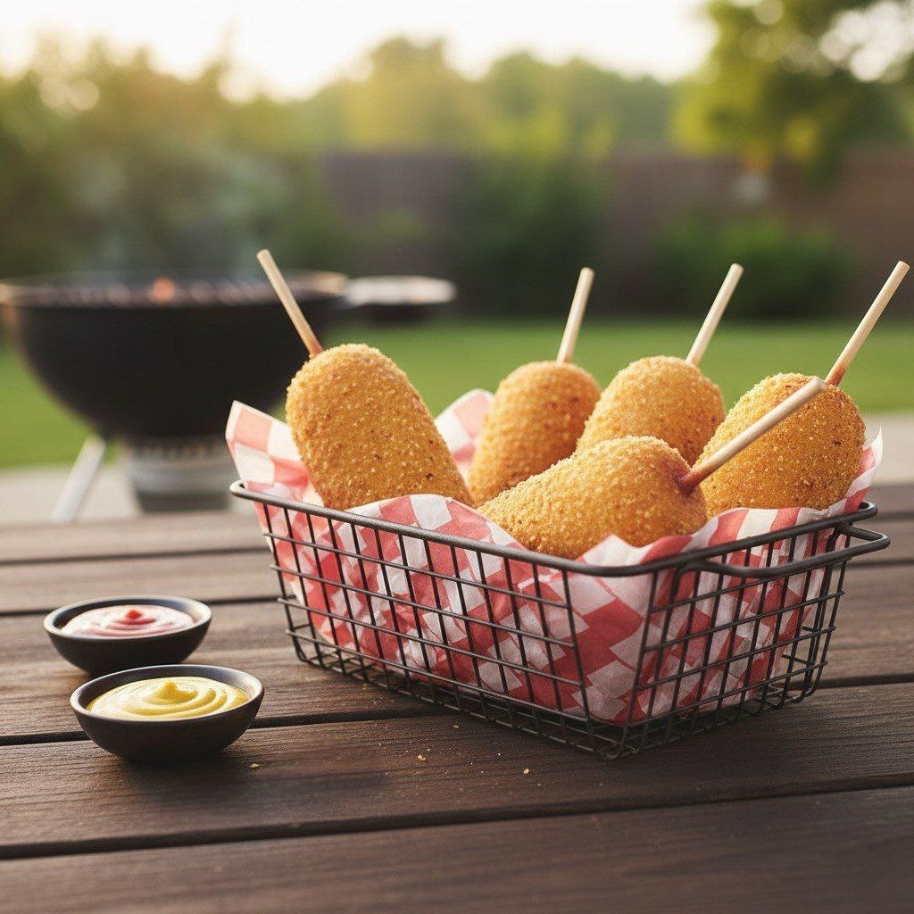 Корн-доги – это классическая американская уличная еда: сосиски в хрустящей кукурузной панировке, обжаренные во фритюре. Приготовить корн-доги дома не так сложно, как кажется! Будет хрустяще, сочно и очень вкусно! Ингредиенты: Сосиски: 8 шт. (выбирайте качественные сосиски, желательно короткие) Кукурузная мука: 1 стакан Пшеничная мука: 1 стакан Сахар: 2 ст. ложки Разрыхлитель теста: 2 ч. ложки Соль: 1/2 ч. ложки Яйцо: 1 шт. (крупное) Молоко: 1 стакан (или немного больше, чтобы добиться нужной консистенции теста) Растительное масло: для фритюра (достаточное количество, чтобы покрыть корн-доги) Деревянные шпажки: 8 шт. (длинные) Бумажные полотенца: для обсушивания корн-догов Подготовка ингредиентов: 1. Подготовка сосисок: Промокните сосиски бумажным полотенцем, чтобы они были сухими. Это поможет тесту лучше прилипнуть. Аккуратно воткните деревянную шпажку в каждую сосику до середины. Если нужно, предварительно сделайте небольшое отверстие ножом. Поместите сосиски на шпажках в морозильник
