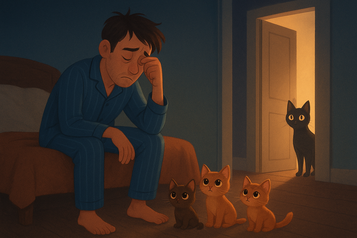 Когда у кошки появились трое отпрысков, сначала всё шло гладко. Они росли, ели и ночью устраивали покатушки на её хвосте. Обычное детство, ничего странного. И вот хозяин однажды решил: пора учить их пользоваться лотком. Миссия воспитательная, серьёзная. Почти педагогическая. Проснулись — он, зевая, тащит всех троих к лотку. Поели — туда же, будто на экскурсию. Поспали — повтор экскурсии. Так весь день бедный мужчина ходил по квартире в роли живого такси. И вроде бы результат был, пару раз котята сходили в лоток. Мужчина уже гордился собой. Даже спина выпрямилась... авторитет, опыт, методика. Но ночью… Он проснулся от странного хорового писка. В дверях спальни маячила торжественная процессия из котят. Все пищат и смотрят на него с надеждой, даже с ожиданием. Он не сразу понял. Потом до него дошло. Котята усвоили, что, чтобы сходить в туалет, надо разбудить дядю и он всё организует. И действительно, зачем утруждаться? Приручили себе персонального человека-лифтёра. Давишь на кнопку «мяу»