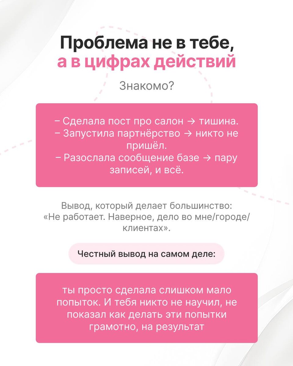 А вы точно туда долбите?🐦 У многих салонов одна и та же история: «Я вроде что-то делаю… но клиентов ноль и выручка не растёт». Сегодня разбираем две вещи, которые ломают поток клиентов сильнее всего: 1. Делаю мало действий. 2. Делаю не туда и не серией, а разово. В карточках рассказываем, по-человечески, что такое «закон больших чисел» и «закон дятла» для салона красоты: почему 1–2 попытки не работают, а 5–7 касаний и 3 партнёрства в неделю — дают поток. 📌Сохраните пост себе + отправьте коллегам, кому это будет полезно