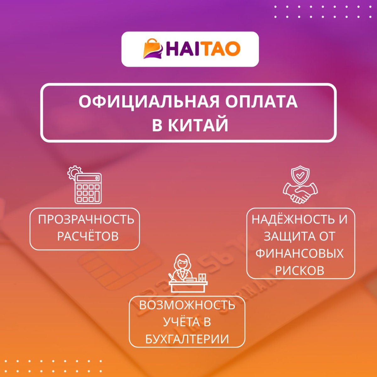 🤝 Haitao — это не просто сервис по выкупу и доставке. Мы выступаем надёжным партнёром между Россией и Китаем, обеспечивая законные и безопасные финансовые операции для вашего бизнеса.