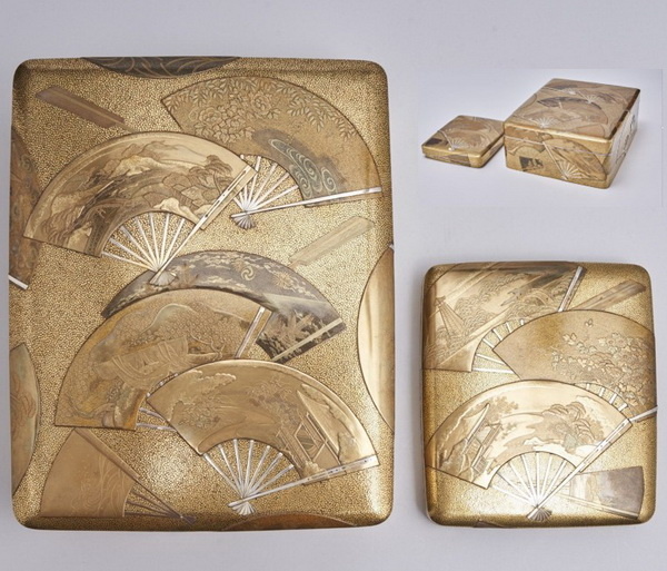 Обе коробки покрыты золотым лаком с изображением наложенных друг на друга вееров.
