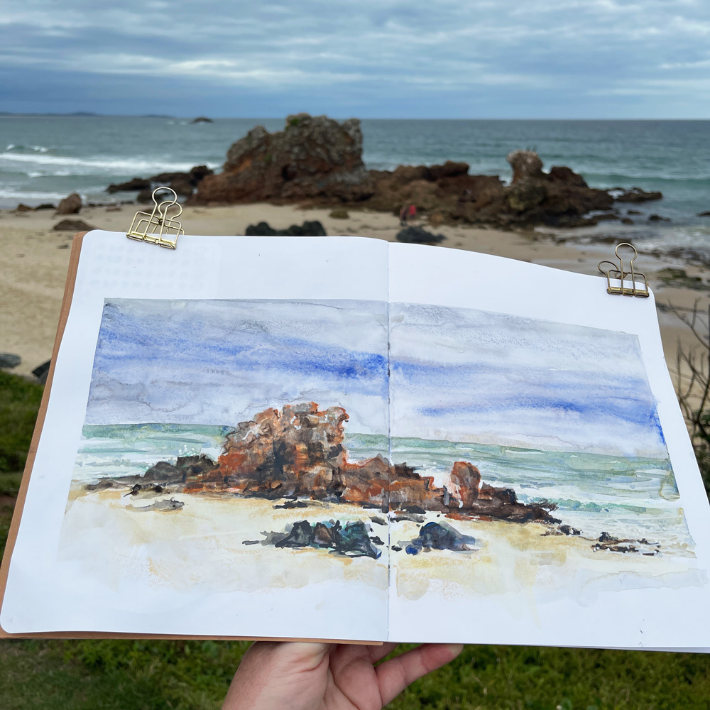 Обычно мои отпуска — это длинные списки «обязательно нарисовать», маршруты, даты, задумки… Поэтому день, в котором нет повестки, стал настоящим подарком. В итоге я провела его на пляжах и в кафе. Как неожиданно — и как по-моему! Я давно заметила: чем меньше давления, тем больше получается. Так вышло и в этот раз — я побывала на трёх пляжах (и на каждом сделала скетч) и заглянула в два разных кафе. Утро я начала с прогулки к пляжу Флиннс через Ноббис-Бич. День был пасмурный. Я устроилась на одном из камней у воды и набросала Нобби-Пойнт. Наверное, это был не лучший день для долгих прогулок — дождь был совсем рядом. Но именно потому, что у меня не было жёсткого плана, я спокойно пересидела дождь и отправилась назад, когда тучи рассеялись. Вот фото пляжа Флиннс — с тем самым каменным выступом, которым я буквально одержима. Кафе при пляже — Sandbox — всегда забито, так что я искренне обрадовалась, когда увидела свободный столик. Вот снимок, сделанный ещё до того, как я приступила к с
