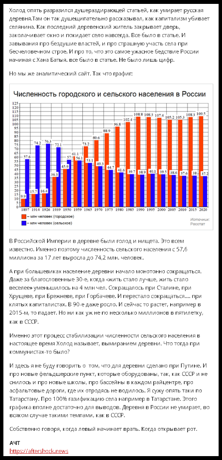 Там мы видим взрывной рост сельского населения в дореволюционной России. И автор противопоставляет этот рост тезису о царивших в то время голоде и нищете. Хотя, очевидно, что одно другого не исключает. Даже наоборот. Посмотрите, в каких странах царит голод и нищета и в каких отмечается стремительный рост населения. Это будут примерно одни и те же страны.