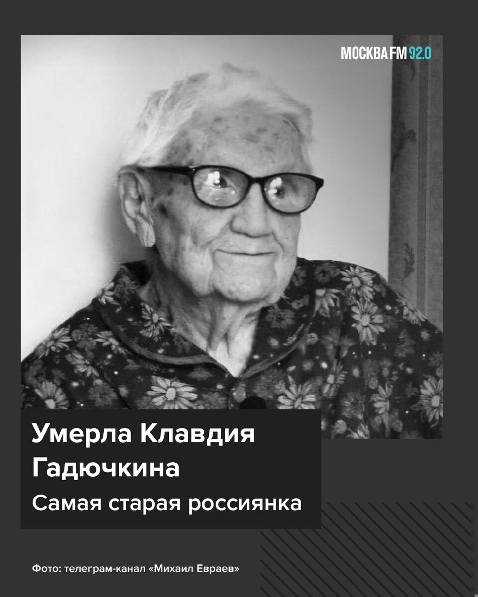 🥀 Умерла старейшая жительница России — Клавдия Гадючкина. Ей было 114 лет О смерти женщины сообщила пресс‑служба правительства региона. До 115‑летия она не дожила всего несколько дней. Губернатор Ярославской области Михаил Евраев тоже выразил соболезнования. Он напомнил, что международная организация LongeviQuest включила Клавдию в пятёрку старейших людей на планете. По словам губернатора, для многих она была не просто рекордсменкой, а примером того, как можно прожить больше ста лет, сохранив ясный ум и любовь к жизни. Сама Клавдия считала, что родилась 24 ноября 1909 года в Ярославле. Но в официальных документах указана другая дата — 5 декабря 1910 года (по новому стилю). Её детство пришлось на тяжёлые времена — Первую мировую войну и революцию. Позже она пережила Великую Отечественную войну. Почти полвека Клавдия проработала на фабрике «Красный Перевал». У неё осталось большое семейство: 6 внуков, 8 правнуков и 5 праправнуков. 📌 Подписаться на Москва FM / Наш чат-бот / Мы в
