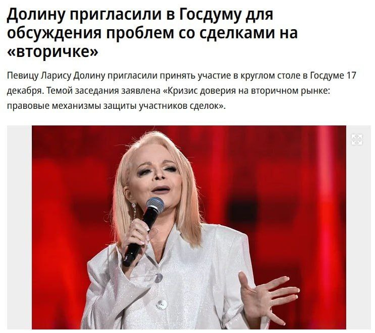 Ларису Долину позвали в Госдуму обсудить проблему мошенничества на рынке вторичного жилья — «Коммерсант». ИнфоСплетник ────────── ⚡️Важные новости – без лишнего шума!⚡️ Подпишись на канал и получай только суть: оперативно, чётко, по делу! 👉 ИнфоСплетник | @infospletnik