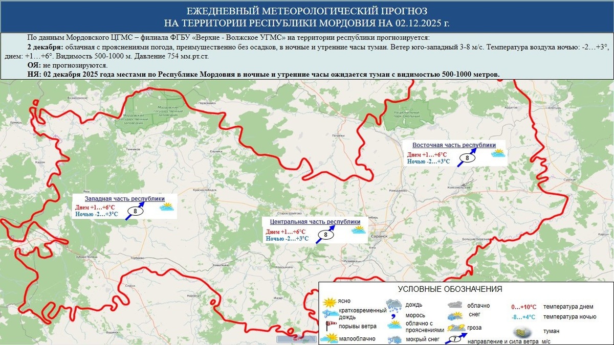 ☁️⛅⛈️ 2 декабря в Мордовии облачная с прояснениями погода, преимущественно без осадков, в ночные и утренние часы туман с видимостью 500-1000 м. Ветер юго-западный 3-8 м/с. Температура воздуха ночью: -2…+3°С, днем: +1…+6°С. Давление 754 мм рт. ст. ✈️ ПРОИСШЕСТВИЯ в Telegram ➡️ Предложить новость 👤 ПРОИСШЕСТВИЯ в MAX