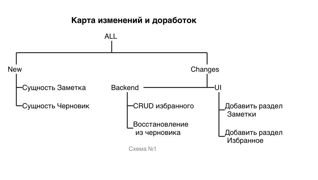 Я и не знал, увидел у коллег, что существуют диаграммы wbs (work breakdown structure). Может помочь быстро обозреть изменения по документу со всеми плюшками от plantuml. Пример на картинке. Код пример тут @startwbs Title Карта изменений и доработок Footer Схема №1 +_ ALL +_ New +_ Сущность Заметка +_ Сущность Черновик +_ Changes +_ UI +_ Добавить раздел \n Заметки +_ Добавить раздел \n Избранное -_ Backend +_ CRUD избранного +_ Восстановление \n из черновика @endwbs #plantuml