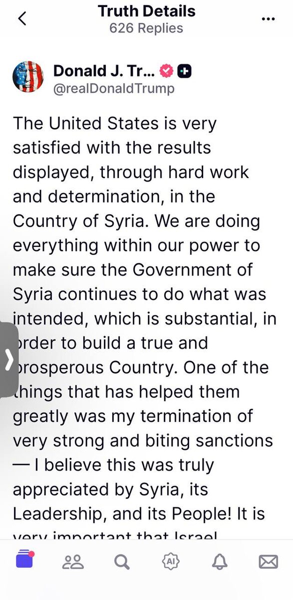 Трамп проснулся и запостил: «Соединённые Штаты крайне довольны результатами, которых удалось добиться в Сирии благодаря тяжёлой работе и настойчивости. Мы делаем всё в наших силах, чтобы сирийское правительство продолжало выполнять поставленные задачи, необходимые для построения настоящей, процветающей страны. Одним из важных шагов стала моя отмена жёстких и болезненных санкций — я уверен, что этот шаг был высоко оценён Сирией, её руководством и народом. Очень важно, чтобы Израиль поддерживал прочный и честный диалог с Сирией и чтобы ничто не мешало её движению к процветанию. Новый президент Сирии Ахмед аш-Шара работает усердно, стремясь обеспечить позитивные изменения и построить долгие и плодотворные отношения между Сирией и Израилем. Это исторический шанс, который дополняет успешные достижения на пути к миру на Ближнем Востоке!»