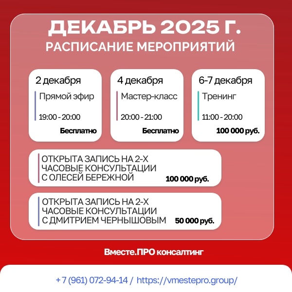 Мы подготовили для вас серию системных и практических мероприятий. Все, что мы делаем, основано на наших реальных знаниях, многолетней практике и уникальном консалтинговом опыте работы с бизнесом с 2001 года. И мы будем рады делится с Вами наработанным опытом и помогать Вам в решений проблем и достижении поставленных целей. РАСПИСАНИЕ МЕРОПРИЯТИЙ ОТ ВМЕСТЕ.ПРО: __________________________________________________________________ 🗓 2 декабря (Вторник), 19:00. Прямой эфир с Олесей Бережной Тема: «Как собственнику бизнеса выйти из кризиса? Подводные камни, на которых теряются деньги» Олеся детально разберет весь цикл проблем, знакомых каждому собственнику малого бизнеса: Куда утекают клиенты? Где деньги? Почему производство превращается в «черную дыру»? Кассовые разрывы. Что на самом деле происходит с компанией, когда в ней нет ФЭМ? Регистрация на прямой эфир (бесплатно): https://vmestepro.group/registratsiya-na-pryamoy-efir