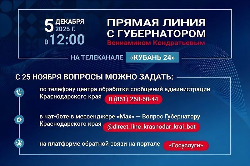◼️Губернатор Кубани ответит на вопросы жителей в прямом эфире «Кубань 24» Вениамин Кондратьев 5 декабря проведёт свою «Прямую линию», в ходе которой будет отвечать на обращения жителей региона. Она начнётся в 12:00. Специалисты уже начали принимать вопросы, задать их можно любым удобным способом: ▪️по телефону центра обработки сообщений администрации Краснодарского края — 8-(861)268-60-44 ▪️в чат-боте в мессенджере «Max» — Вопрос Губернатору Краснодарского края @direct_line_krasnodar_krai_bot ▪️на платформе обратной связи на портале «Госуслуги» — https://pos.gosuslugi.ru/lkp/direct-line/10722/ Ни одно обращение не останется без ответа. Даже те, которые не успеют прозвучать в прямом эфире, изучат и возьмут в работу. 💬 Наш чат для общения 🚀 Подписаться на Архипка Live 📥 Прислать фото, видео, новость 📲 Архипка Live в MAX
