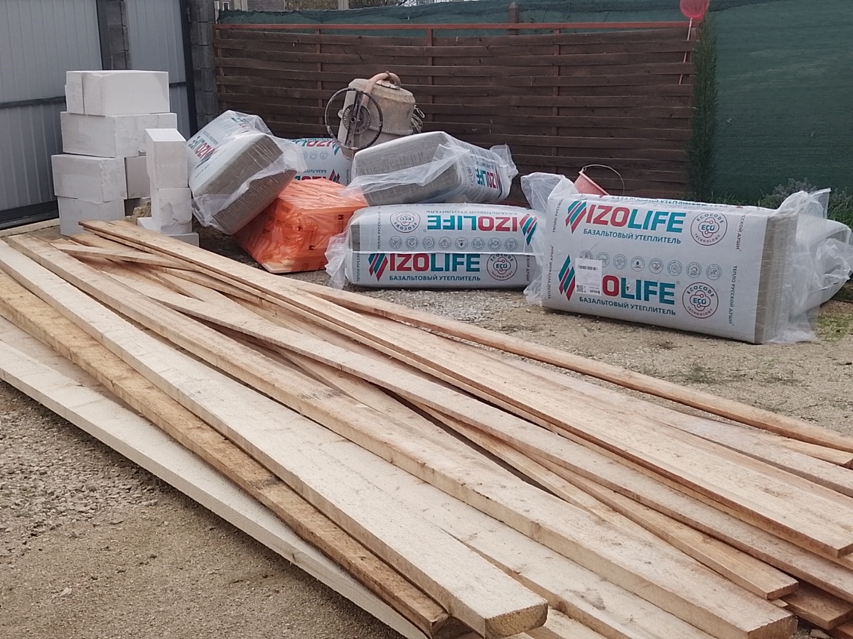 Здравствуйте! Закончил кровлю в Крымской глубинке, надо уже за свою приниматься, на новой бане. Так что с утра субботы составил снабженцу список материалов, а сам полез на стройку, надо на армопояс еще для начала один ряд газоблока положить, по передней и боковым сторонам. К обеду подъехал и материал. Доски и на стропила и на обрешетки, и утеплитель и не достающий газоблок. Утеплителя, который раньше покупали нет в наличии, так что купил вот такой. Тот же базальтовый утеплитель, правда маты, по ощущениям чуть меньшей плотности, чем тот же изобокс или роклайт. Очень похож на утеплитель Парок, который прекрасно выполняет свою функцию у нас на доме. Думаю и этот будет не хуже. Для стен, даже в каркасном доме, плотность сомнительна, а вот на перекрытие думаю будет самое то. Почти одиннадцать квадратов в упаковке,довольно не плохая теплопроводность, обработана от влаги и грызунов, полностью не горючая. То что надо. Вроде заказывал на маркетплейсе простую пароизоляцию от компании О