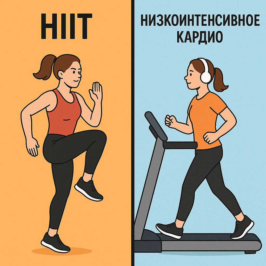 Обе системы — HIIT и низкоинтенсивное кардио — работают. Но эффект и подход разный: HIIT «взрывает» тело, ускоряет обмен и тренирует мощность, а спокойное кардио строит базу и бережёт нервную систему. Разберёмся, кому подходит каждая стратегия и как их правильно комбинировать. ⚡️ HIIT — интенсивно, коротко, результат быстро Что это: короткие интервалы высокой нагрузки (20–60 сек) с паузами отдыха.