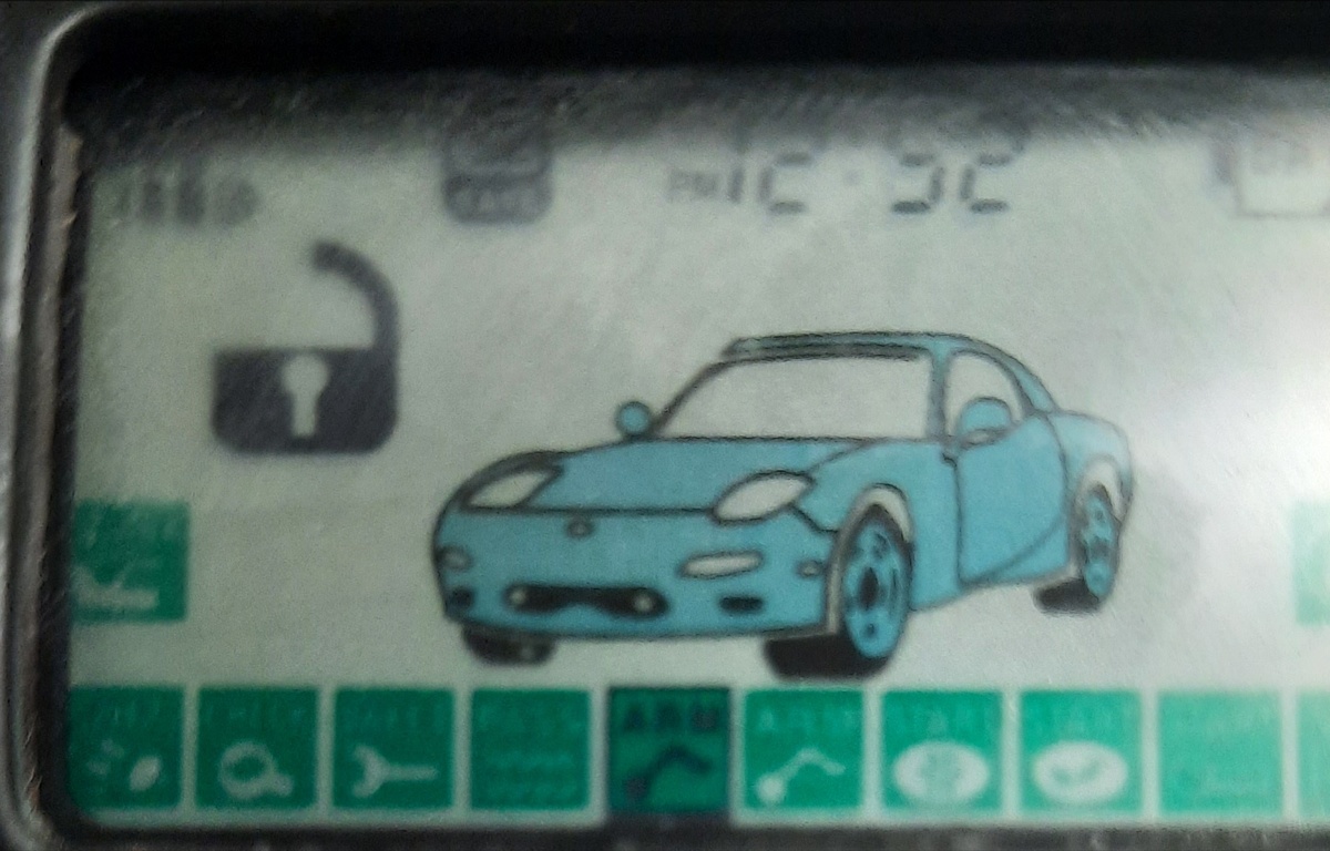 - 2.Нажатиями кнопки 3 брелка установите курсор в положение, соответствующее нужной команде (например,команде включения и выключения режима охраны иконка АRM