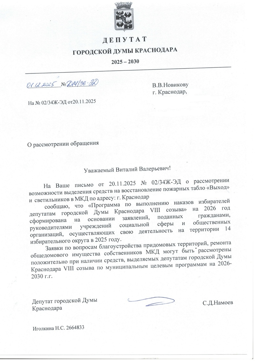 Ежегодно, депутатам городской думы Краснодара, выделяют деньги на проведение ремонта в школах, библиотеках, детсадах и многоквартирных домах, расположенных на территории избирательного округа соответствующего депутата. Я направлял обращение депутату Намоеву Сергею Джемаловичу, с просьбой выделить деньги на ремонт пожарных табличек "Выход" на лестничных клетках и светильников в местах общего пользования МКД. Эти пожарные таблички и светильники постоянно ломают закладчики, которые там прячут закладки. В милицию обращался - никакой реакции. Для ремонта табличек "Выход" и светильников, управляющая компания в моем доме, насчитала смету за эти работы более, чем в 200 тысяч руб.