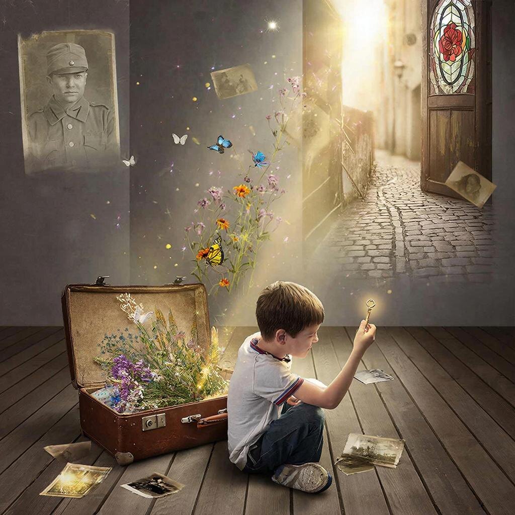 В городе, где небо часто плакало серыми слезами, жил мальчик по имени Яша. Его мир был тихим и упорядоченным: ровные линии панельных домов, одинаковые площадки, серый асфальт. Даже радуга, появляясь после дождя, казалась ему бледной и невыразительной. Однажды, разбирая вещи на антресолях, Яша нашёл старый кожаный чемодан, пахнувший пылью и чем-то ещё — сладковатым, древесным и тёплым. В нём не было ничего ценного: потёртая тетрадь с полевыми заметками, засушенный цветок, несколько старых фотографий и странный ключ с орнаментом в виде спирали. Яша собирался закрыть чемодан, но его рука случайно коснулась фотографии. И вдруг... он почувствовал то, чего не было на снимке. Он не просто увидел молодого человека в военной форме — он ощутил на своей ладони шершавую ткань гимнастёрки, услышал отдалённый гул самолётов и почувствовал вкус горького дыма. Он отдернул руку, испуганный и ошеломлённый. Осторожно, кончиками пальцев, он снова прикоснулся к засушенному цветку. Поляна. Жара. Стре