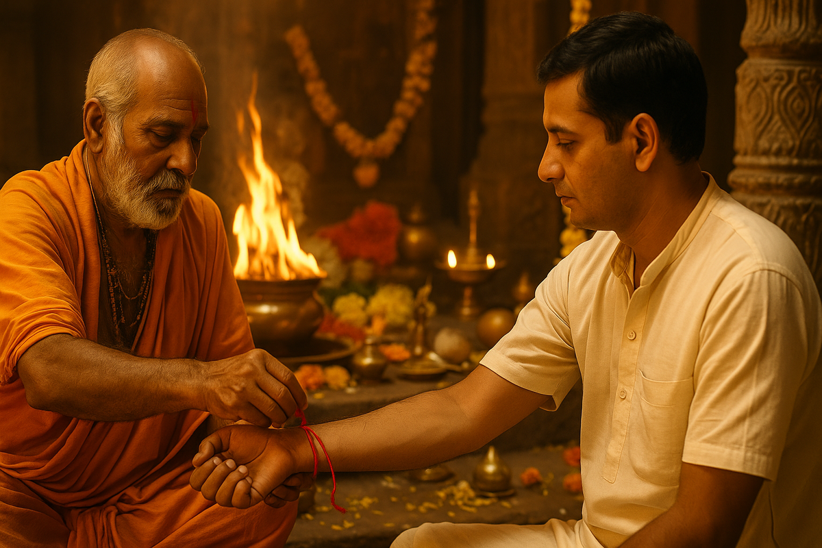 Часто нить завязывает священнослужитель после пуджи. Она не «отражает сглаз» — она связывает человека с сакральным.