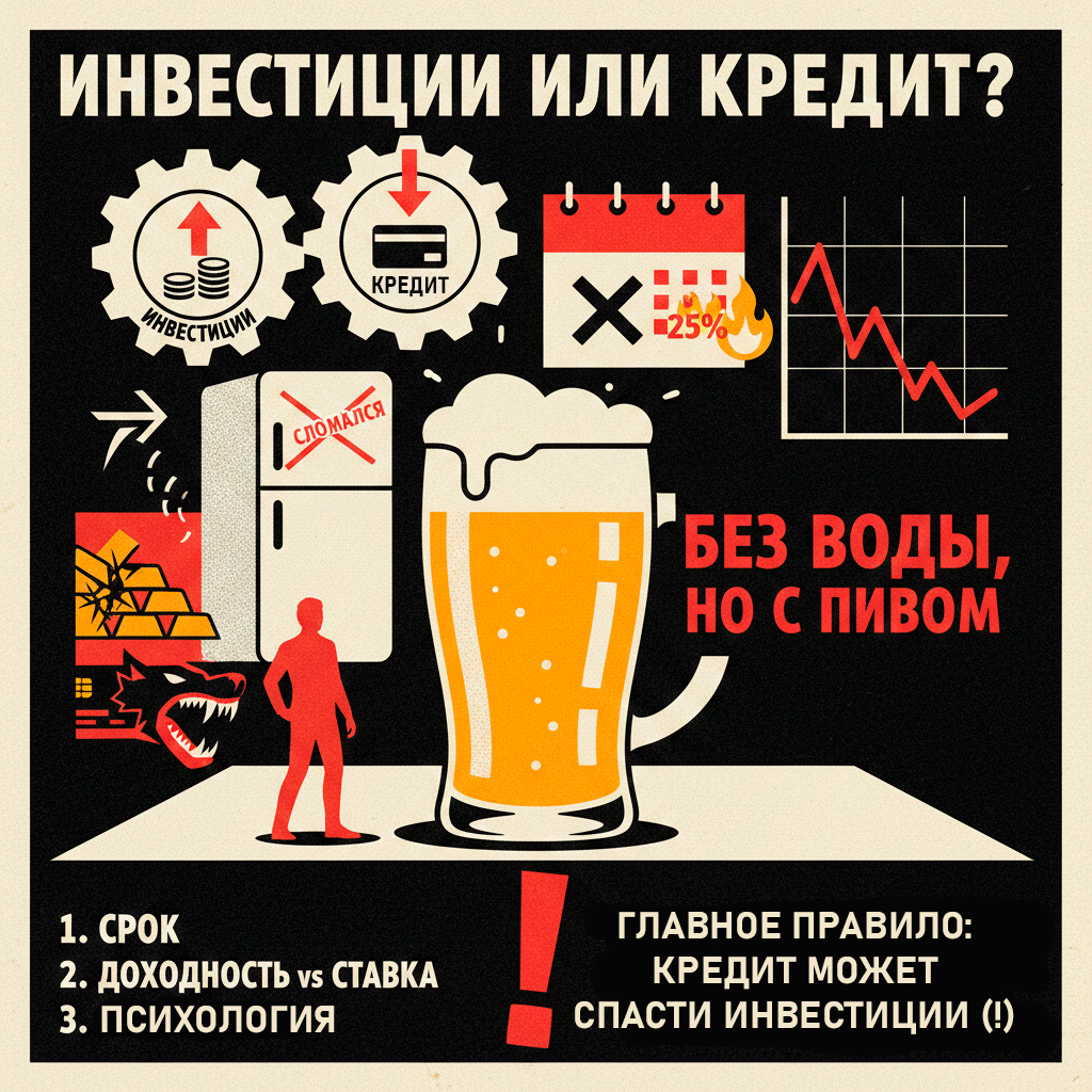 Представь, что ты находишься в следующей ситуации. Ты уже научился откладывать деньги, покупаешь какие-то ценные бумаги, крипту или просто открыл депозит. Короче, инвестируешь. Однако, современная жизнь слишком взрослая и непредсказуемая. Часто бывает, что появляется какое-то обязательство: купить новую мебель, оплатить лечение или отпуск. В общем, тебе нужно что-то купить, а денег не хватает. У тебя два варианта: достать деньги из инвестиций или воспользоваться кредиткой. Кредитка часто так и манит беспроцентным периодом. СТОП. Отставить магическое мышление. Беспроцентный период — это не подарок от банка, а ловушка, прикрытая бархатом. Это как бесплатная первая кружка пива: выпить-то дадут, но чтобы уйти, придется заказать еще. И тут уже посчитают по полной. Так что же выгоднее: резать свои инвестиции или брать в долг у банка? Давай прикинем на цифрах, как настоящие мужики. Ситуация: Тебе срочно нужны 100 тысяч на холодильник (старый, будь он неладен, взял и сломался). У тебя есть 10
