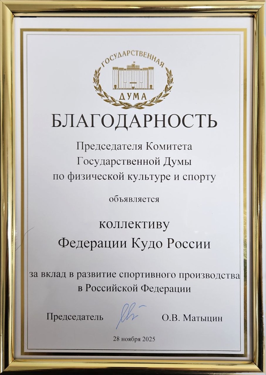 ⚡️ Определены лауреаты III Всероссийской премии «Золотой Диалкон» В Москве подвели итоги III Всероссийской спортивной премии «Золотой Диалкон», проводимой при поддержке Комитета Государственной Думы по физической культуре и спорту. Торжественное награждение лауреатов состоялось на форуме «Спорт Бизнес Конгресс» 28 ноября на Большой спортивной арене «Лужники». Эксперты в области спорта и промышленности вручили победителям эксклюзивные награды. Федерация КУДО России была отмечена Благодарностью от Председателя Комитета Государственной Думы по физической культуре Матыцина О. В. в рамках номинации «Поддержка отечественного производителя спортивной экипировки». Выражаем огромную благодарность организатору премии Объединению «Диалог Конверсия» и жюри конкурса, за высокую оценку вклада ФКР в развитие отечественных производителей наградной, сувенирной продукции, а также некоторой экипировочной продукции для кудо. Премия «Золотой Диалкон» учреждена крупнейшим российским производителем нагр