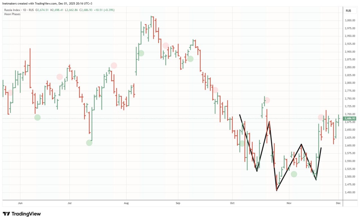 ❗️1 декабря российский фондовый рынок подрос, индекс МосБиржи укрепился на 0,39% до уровня 2686,93. Сегодня сложился маловолатильный, относительно спокойный день, я бы даже не сказал, что рынок ждет чего-то, скорее он никак не может собраться с силами, чтобы вырасти, наверное, все эти ожидания мирного урегулирования - они даже мешают, так как приходится все время оглядываться на международную обстановку. В целом же техническая картина более чем благоприятная, "перевернутая голова-плечи" уже может считаться подтвержденной фигурой, в отдельных бумагах ситуация также положительна, а значит мы можем ожидать продолжения движения вверх. 👉 Наш российский 🇷🇺 портфель — индекс ФТинвест прибавил 0,24% и достиг уровня 797,5994, чтобы следовать нашему индексу подпишитесь в закрытом телеграмм-канале. Курс доллара США по данным ЦБ РФ сегодня снизился на 0,67% и составил 77,7027 руб. Нефть WTI выше на 1,23% до $59,27 за баррель, а Brent на 1,12% и стоит $63,08. Золото сегодня выше на 0,10% и