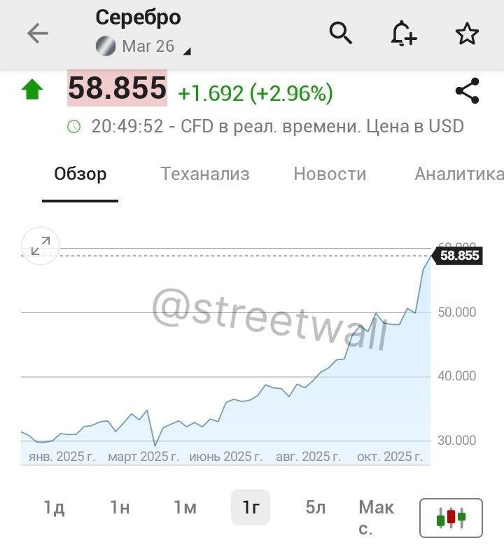 Фьючерсы на серебро летят в космос, за год их цена увеличилась на 102%. Сегодня их стоимость обновила исторический рекорд: $59 за унцию. ИнфоСплетник ────────── ⚡️Важные новости – без лишнего шума!⚡️ Подпишись на канал и получай только суть: оперативно, чётко, по делу! 👉 ИнфоСплетник | @infospletnik