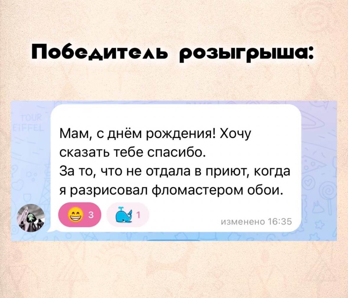 Привет, друзья! Мы долго думали и внимательно прочитали все ваши комментарии под розыгрышем. В итоге, решили выбрать самый неожиданный комментарий с поздравлением. 2 персональных видеообращения в тг кружке: достается 🥁🥁🥁🥁 @Danilexxe - свяжитесь с нами Спасибо всем за участие! 😍Поставьте реакции и поздравьте победителя 🎉👏