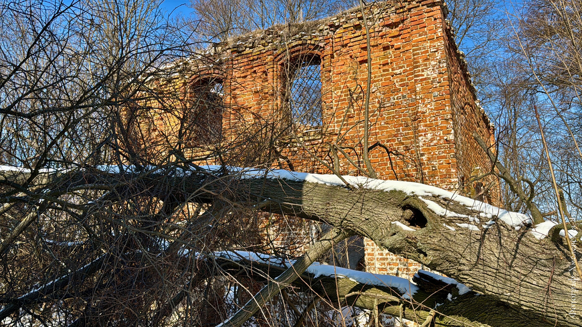 Во второй раз в Юрьево я ехала уже не из любопытства, а «проверить изменения». Первый визит был летом: жарко, зелень по пояс, храм спрятан в листве так, что его приходится буквально выцарапывать глазами из леса. Тогда в усыпальнице я нашла раненую лису — живая, в крови, на дне каменного провала усыпальницы. Позже местные мужики её оттуда вытащили. Сейчас я вернулась в Юрьево уже зимой. На том самом месте, где в прошлый раз была кровь на траве, теперь лежит огромное поваленное дерево — будто кто-то нарочно положил поперёк истории жирную чёрту. Церковь Преображения стоит на пригорке, спрятанная в ветках. Без колокольни, без крыши — только стены четверика и пустой глазницами окон. Внутри — обрывки росписей, по которым, кажется, стреляли: где-то пробоины, где-то выщербленные лица святых. Рядом — часовня-усыпальница Полонских. Снаружи она выглядит гораздо лучше храма: аккуратный объём, лепнина, надпись над входом «Блажен путь, в онь же идеши днесь, душе, яко уготовася тебе место упокоения!