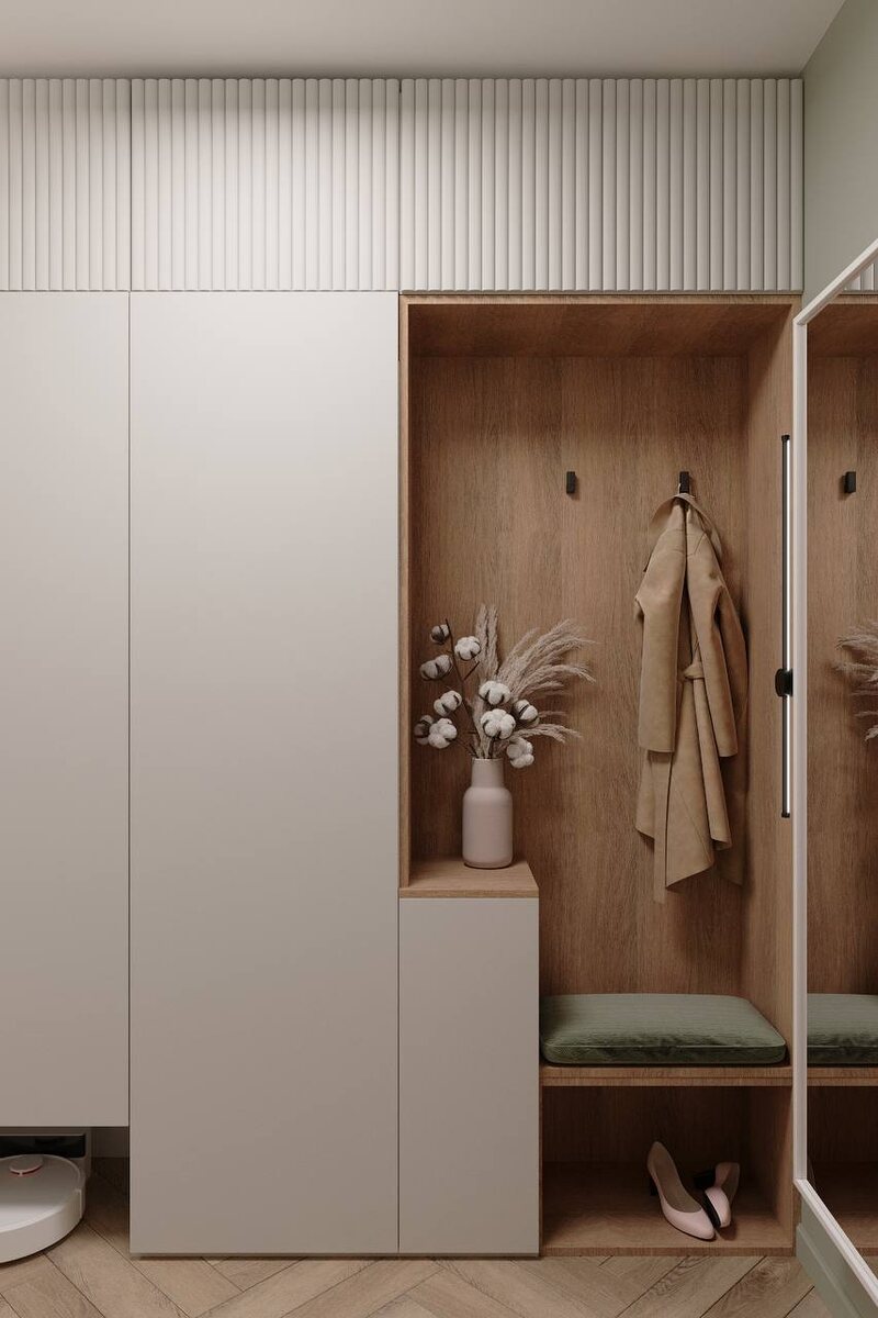 Привет всем! 👋 Делюсь нашей прихожей. Задача: ✅Сделать красивую прихожую, за которой «прячутся» сантехнический люк, эл.счетчик, роутер и прочие необходимые, но неэстетичные вещи. И чтобы доступ ко всему этому остался! ✅Стены только красим, потолок не трогаем, розетки не добавляем, бра на батарейках ✅ Шкаф для одежды, отделение для робота пылесоса ✅Обувница Решение: 1. Шкаф сделали глубиной 45см. 2. Секретная дверца — панель с крючками. Выглядит как часть отделки, но открывается на петлях, открывая доступ к люку. 3. Зеркало — тоже на петлях! 4. Магнитная маскировка — роутер закрыт декоративной накладкой на магнитах. Снял-установил за пару секунд. 5. Единственное, что осталось на виду — пожарный оповещатель. Его трогать нельзя, да и не стали мудрить — безопасность важнее. А нагромождать антресолями не захотели. Вот так, с помощью продуманной мебели, можно превратить технический уголок в часть гармоничного интерьера. #дизайнпроект #практичныйинтерьер #ремонтквартиры #интерьерныелайфх