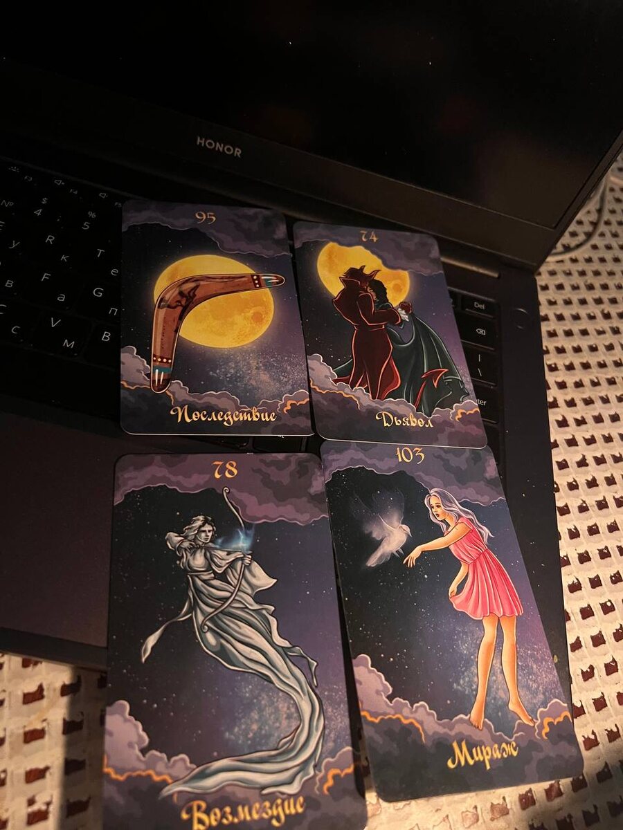 1: Последствия Здесь работает принцип бумеранга то есть что посадили то и пожмем. На это недели вы либо собираете плоды, либо уроки. 2: Дьявол Кайфую от этой карты так как чаще всего эта карта обозначает деньги. Но ещё и искушение на этой неделе у вас будет очень много соблазнов.важно Разделять материальные и духовным. 3: Возмездие Очень важно контролировать свои эмоции на этой неделе. Не вступать в конфликты. 4: Мираж На этой неделе очень много будет построена воздушных замков 🏰🏰🏰 вам нужно держать холодную голову. Если вы правильно распределите свой творческий потенциал выйдет хороший проект.