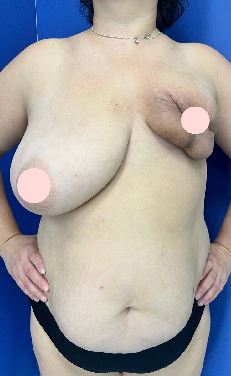 Операция: 1 этап: реконструкция левой молочной железы лоскутом широчайшей мышцы с установкой экспандера. 2 этап: Замена экспандера на имплант слева, риск-редуцирующая подкожная масткэтомия справа с установкой импланта 3 этап: круговой бодилифт Что происходит с телом после онкологического заболевания?