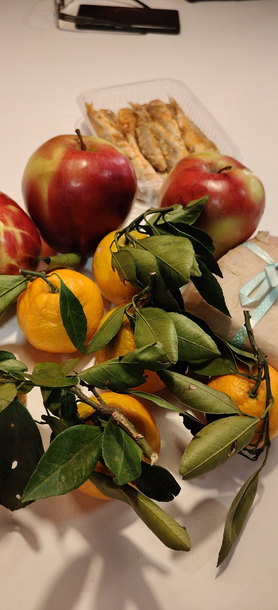 Купить накануне свежей барабульки, почистить и пожарить, чтобы потом принести на встречу! Это меня поразило🙏. Ещё и мандарины с веточками (словно игрушки на ёлку новогоднюю), огромные яблоки и адыгейский сыр (специально куплен на рынке)! Всё, что я действительно люблю!