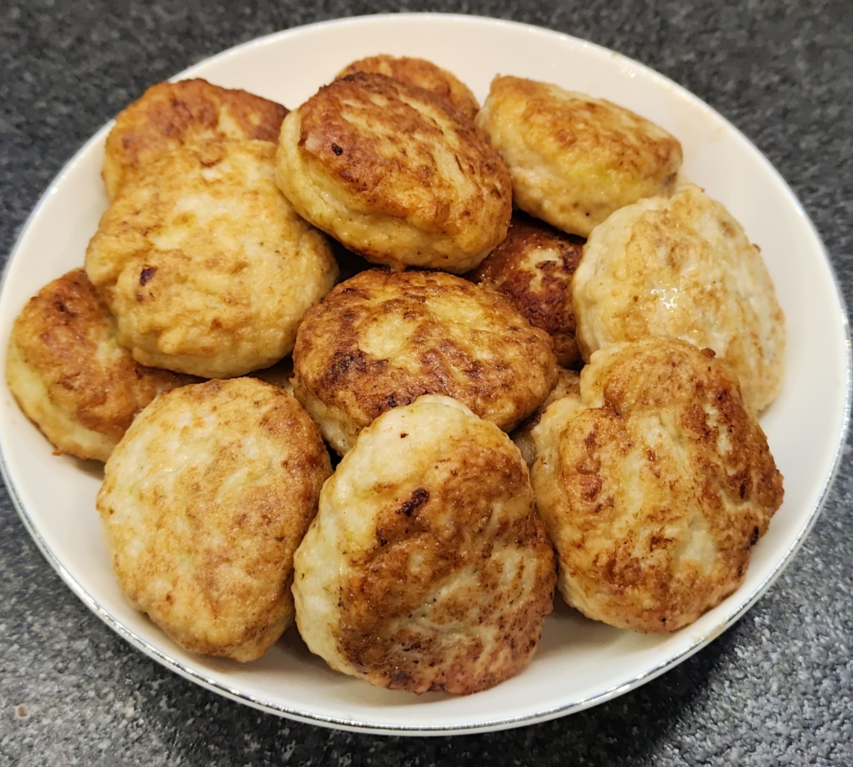 В этих котлетах нет хлеба и яйца , только куриное филе, кабачек , лук и соль с перцем . Они получаются сочные ,нежные ,ароматные и вкусные . На самом деле повара не кладут яйца в котлеты , так как они забирает влагу, делают котлеты жёстче. ИНГРЕДИЕНТЫ : Куриный фарш - 600гр Кабачек- 250 гр Крахмал - 1 чайная л Чеснок - 1 зуб Лук -1шт Соль,перец по вкусу Растительное масло для обжаривания Мука для панировки ПРИГОТОВЛЕНИЕ : Куриное филе ,лук и чеснок пропустить через мясорубку, в фарш потереть кабачек на мелкую тёрку. Посолить, поперчить, добавить крахмал и хорошо все перемешать. Формировать котлеты, обвалять в муке и обжарить на предварительно разогретой сковороде с двух сторон до золотистого цвета, сложить котлеты на противень и поставить в разогретую духовку 180градусов на 10-15 мин,довести до готовности . Вуаля, сочные котлетки готовы ПРИЯТНОГО АППЕТИТА !