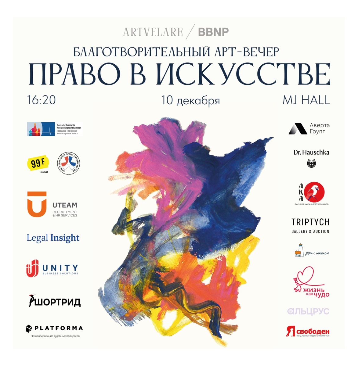 Приглашаем на легендарный Благотворительный арт-вечер «Право в искусстве» — событие, в котором гармония права и вдохновение искусства сливаются в одном восхитительном декабрьском вечере! Юридическая фирма BBNP в блестящем союзе с культурно-деловым проектом ArtVelare создали нечто гениальное: потрясающий праздник чувств, красоты, вдохновения, и Ваш идеальный повод выгулять своё сногсшибательное платье и костюм, ощутив себя частью компании единомышленников, выйдя за рамки формальностей в потрясающем лофт-пространстве MJ Hall. Кадровая компания UTEAM– информационный партнер вечера. Приобрести билет можно по ссылке: https://artvelare.bbnplaw.ru/?utm_source=uteam&utm_medium=article&utm_campaign=art_evening_10-12-2025 Вас ждёт роскошная атмосфера: ▫️ Эксклюзивное пространство уютного особняка, где свет, великолепные картины и живая музыка создают ту самую уникальную обстановку для настоящего диалога и новых знакомств; ▪️ Воодушевляющая дискуссия о смысле профессии, праве и искусстве, где к