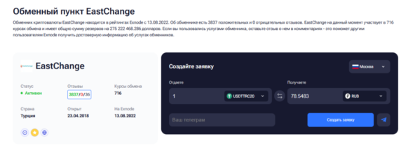 Первый шаг — определить площадку, которой можно доверить операцию. Удобнее всего делать это через мониторинг Exnode, где собраны лучшие криптообменники с проверенной репутацией. На платформе достаточно выбрать подходящий сервис, нажать на его название и заполнить короткую форму, указав валютную пару, город и ваш ник в Telegram. Такой формат позволяет сохранить конфиденциальность и при этом быстро передать необходимые данные.