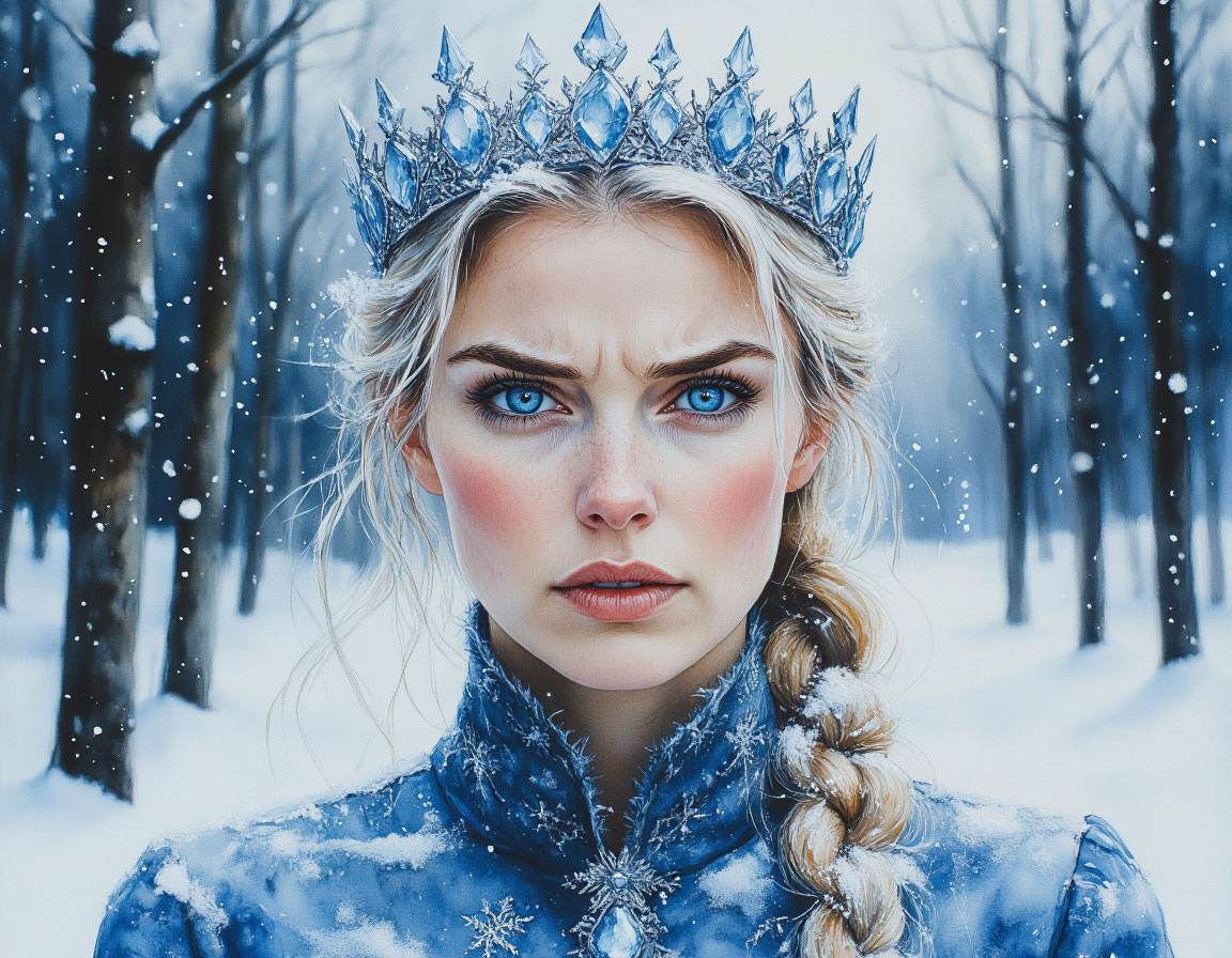 Я видел её впервые на рассвете третьего дня. Она стояла на холме за деревней - высокая, стройная фигура в одеяниях из сплетённых метелей. Её волосы были вихрями снега, а лицо - безупречной маской из лунного света. Красота её была столь совершенна, что от одного взгляда ломило зубы, а в груди разрастался ледяной ком. Деревья вдоль дороги превратились в изваяния из хрусталя. Каждый лист, каждая ветка покрылись инеем, образуя причудливые узоры - словно неведомый мастер выгравировал на них тайные знаки. Дома застыли в безмолвии: дым больше не поднимался из труб, окна потемнели, будто ослепли, а двери покрылись коркой льда, на которой проступали странные символы - то ли следы когтей, то ли письмена на забытом языке. В первую ночь она прошла по улицам. Я видел её из окна - она скользила над землёй, не касаясь снега, и от её прикосновений окна покрывались морозными цветами, всё более сложными, всё более живыми. Казалось, эти узоры дышат, пульсируют, тянутся к теплу внутри домов. Люди выходи